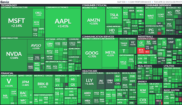 Major Indices S&P 500 : +1.67% → 5,375.86 Dow Jones Industrial Average : +1.07% → 39,606.57 Nasdaq 100 : +2.28% → 18,693.26 Russell 2000 : +1.53% → 1,919.14 Market Overview U.S. stocks extended their rally on Wednesday, fueled by easing trade tensions and signs of stability in monetary policy. President Donald Trump adopted a more conciliatory tone on U.S.-China trade, hinting at potential tariff reductions and reaffirming Federal Reserve Chair Jerome Powell’s job security. The remarks reassured markets wary of political interference in economic matters, sparking widespread buying across sectors. Technology stocks led the charge, reflecting renewed confidence in growth-oriented names, particularly in electric vehicles and semiconductors. The upbeat sentiment follows a sharp two-day rally as investor anxiety over global trade and Fed independence began to ease. Sector Highlights Technology : The tech sector surged, with the Nasdaq gaining 2.5%, as inve...